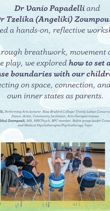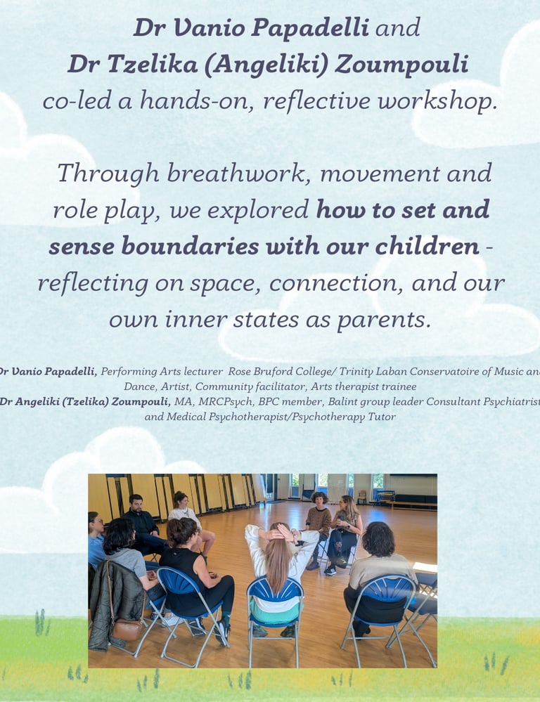 It has been a pleasure to work with Vanio on this workshop! She is overflowing with creative ideas and her curiosity and passion on mental health issues is infectious . She combines professionalism,warmth and enthusiasm as well as a deeply humane empathetic approach that was moving for both me as her co-facilitator and the attendees. She also combines an expertise in embodied movement with awareness on complex mental health issues such as boundary setting within a parent-child relationship. She created a very welcoming atmosphere and attendees felt safe to explore and experiment with their own boundaries